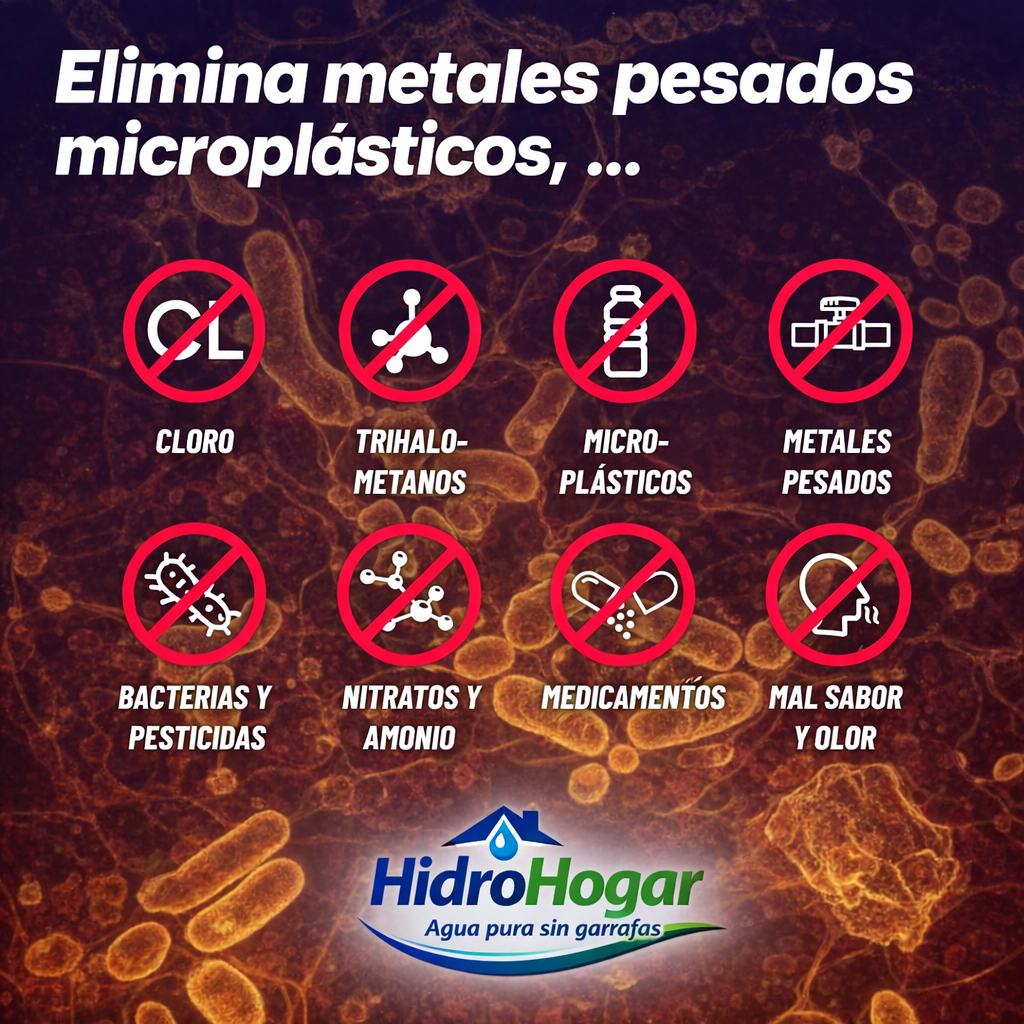Elimina hasta el 99% de impurezas, cloro, metales pesados y microplásticos.
